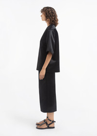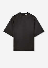 Crafted from lustrous duchess satin, this sculptural top combines structure with ease. Designed with a round neckline and wide short sleeves, the silhouette is clean and architectural, draping softly through the body. Finished with a concealed zipper at the back for a refined, minimal look. Details - Black - 100% Polyester - Dry Clean Only - Back Concealed Zipper - Style Number: 1066MBPD-PS26 Size & Fit - Designed for a relaxed, boxy fit that drapes softly through the body - Size down for a more tailored silhouette - Concealed back zipper for easy closure - Measures 29" from shoulder to bottom hem - Model Height is 179 cm / 5'11 in