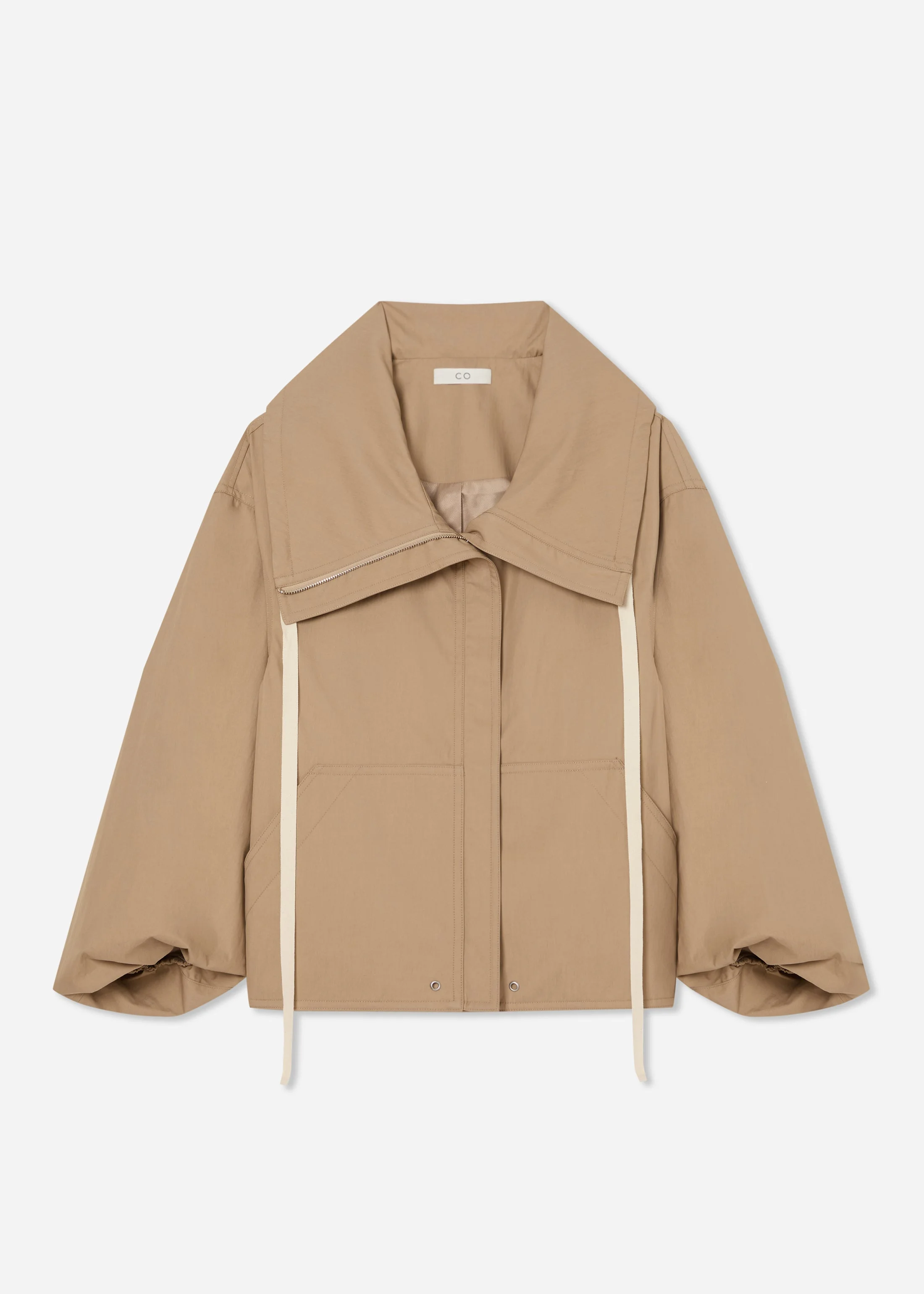 Crafted from a water-repellent cotton-nylon twill, this jacket combines utility and refinement. The rolled funnel collar, voluminous sleeves, and relaxed silhouette create a sculptural shape with effortless ease. Details - Camel - 72% Cotton, 28% Nylon - Front Zipper Closure - Dry Clean Only - Style Number: 6495WRT-PS26 Size & Fit - Designed for an oversized, boxy fit - High rolled collar with adjustable drawstrings - Dropped shoulders and voluminous sleeves - Sleeve measures 7/8" - Measures 26" from shoulder to bottom hem - Model Height is 179 cm / 5'11 in