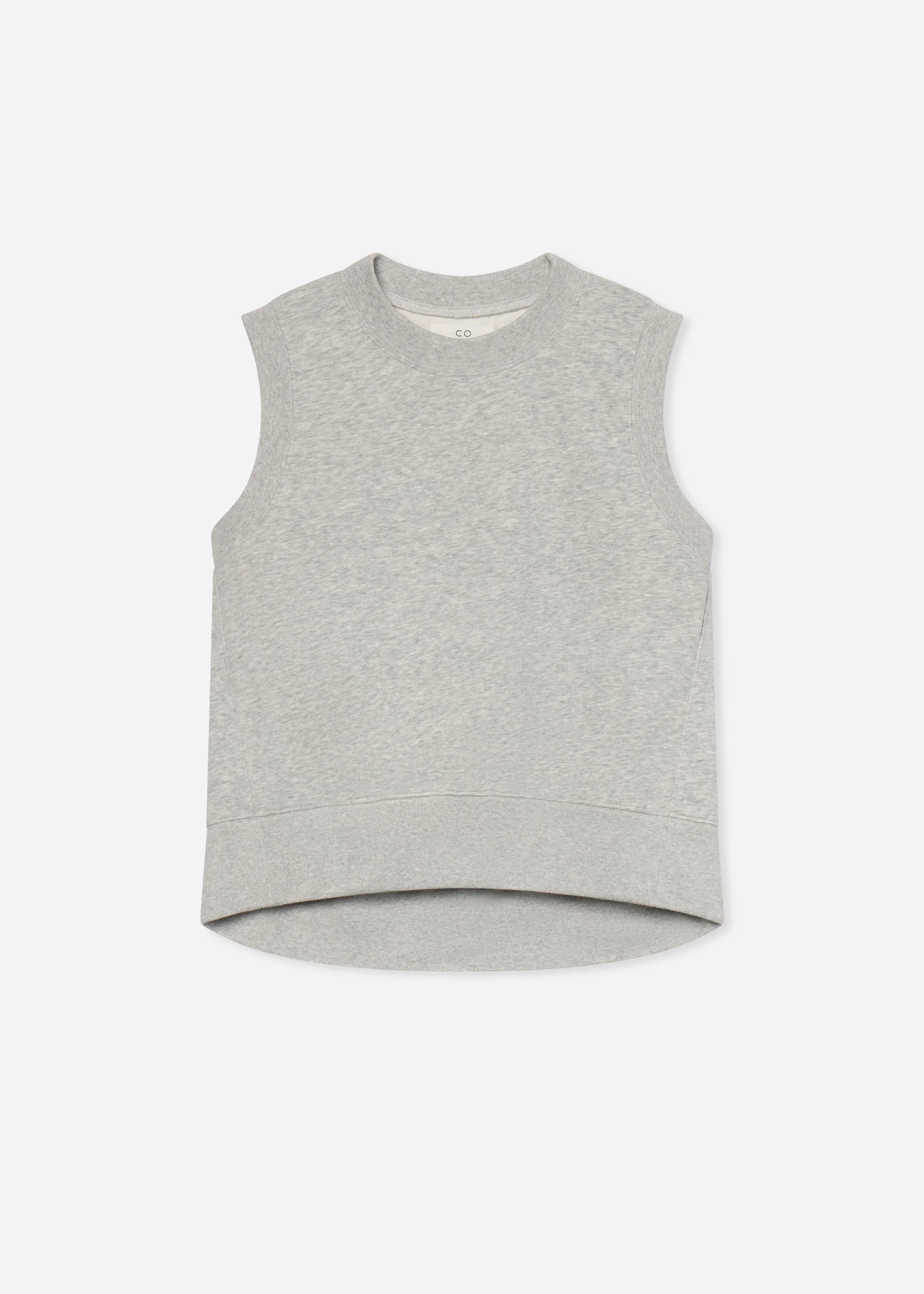 A modern update to the classic crewneck, this sleeveless sweatshirt is crafted from spongey cotton and tencel knit with a brushed interior. Its sculptural side openings and structured drape subtly reference the clean lines of scuba jersey. Designed with a relaxed fit, high neckline, and subtle A-line shape, it’s finished with wide ribbed trim for a refined, architectural silhouette. Details - Heather Grey - 60% Cotton 40% Tencel - 2870CSNL-CORE Size & Fit - True to size.