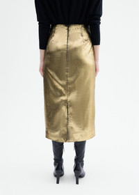This sculpted midi skirt is cut from a high-shine material that catches the light with a rich, molten sheen. Designed with a clean waistband and structured silhouette, it features a discreet center back invisible zip for a seamless finish. This piece makes a striking statement for evening or occasion dressing. Details - Gold - 85% Polyester 15% Polyurethane - Back Zipper Closure - Dry Clean Only - Style ID: 3397HFV-F25 Size & Fit - True to size. - We recommend choose your size based on your waist measurement.
