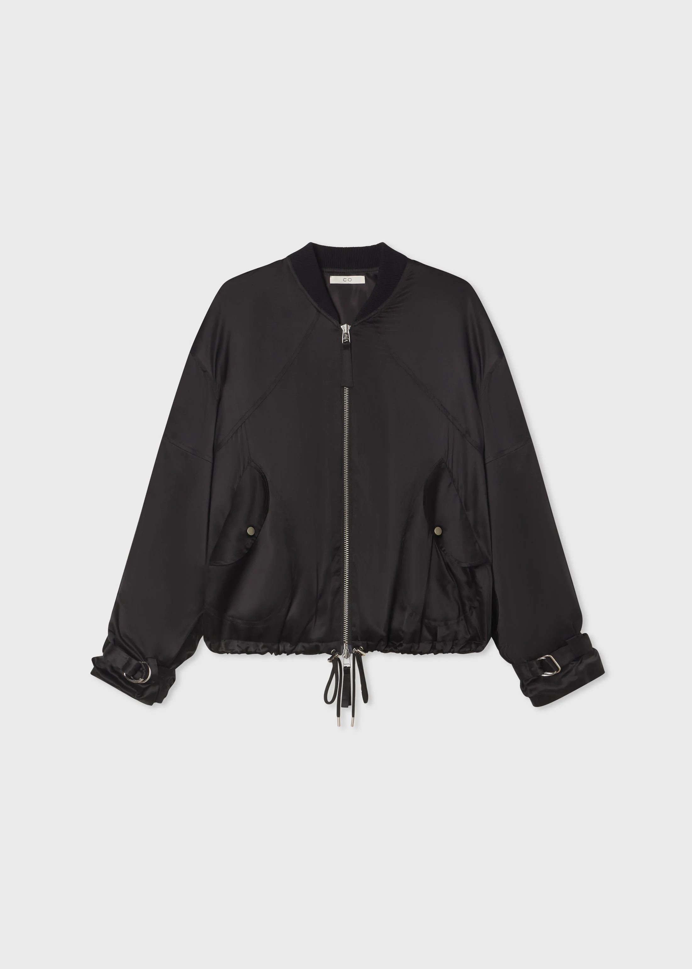 Crafted in silk charmeuse, this bomber jacket reinterprets a utilitarian silhouette with fluidity and light. The softly draped shape is defined by an exposed front zip, rounded sleeves with adjustable tabs, and a drawcord hem that allows for subtle shaping. Details - Black - 100% Silk - Front Zipper Closure - Dry Clean Only - Style Number: 6801NLSC-PS26 Size & Fit - Oversized silhouette with dropped shoulders - Adjustable cuffs and hem - Measures 26" from shoulder to bottom hem - Model Height is 179 cm / 5'11 in
