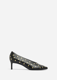 Crafted in Italy from supple calfskin, this pointed ballerina pump merges timeless refinement with subtle edge. Polished gold studs accent the classic black leather, bringing dimension to its sculpted silhouette. Defined by quiet strength and modern poise, it embodies effortless sophistication. Details - Black - 100% Calfskin Leather - 55mm kitten heel - Made in Italy - Style ID: 0498AGN-BLA Size & Fit - We recommend sizing down a half size. - 55mm kitten heel - Softly pointed toe and low-profile silhouette elongate the foot