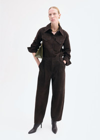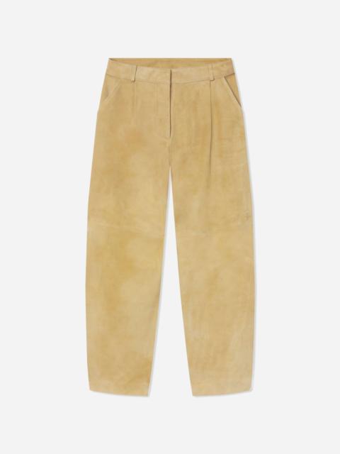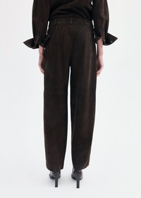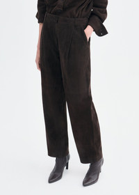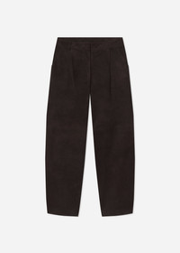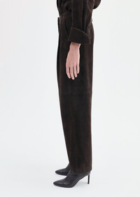 Tailored ease in soft structure. Expertly crafted from supple suede, these trousers feature a sculptural curved leg with a fitted waist and tapered ankle. Flat, wide pleats create a relaxed fit through the hips, while side pockets and a concealed metal zip add functional refinement. A modern silhouette with timeless appeal. Details - Chocolate - 100% Goatskin - Dry Clean Only - 5067AGS-PF25 Size & Fit - True to size. - 29" inseam across all sizes