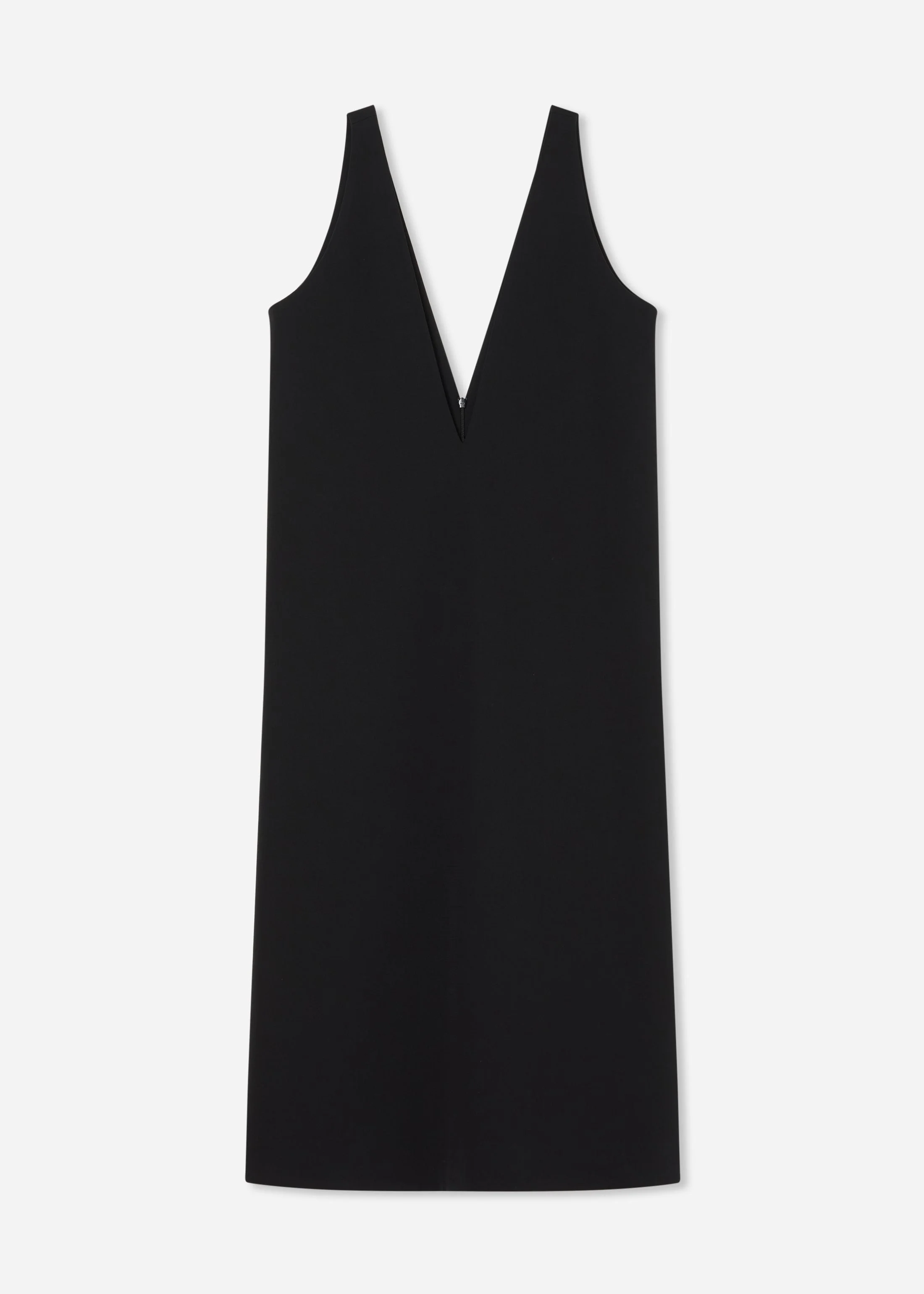 Crafted from cotton, this sleeveless midi dress embodies effortless structure and quiet strength. Defined by deep V-necklines at the front and back, it skims the body with sculptural simplicity. Finished with discreet side pockets and a concealed back zipper. Details - Black - 100% Cotton - Dry Clean Only - Pockets - Style Number: 4507VWCS-PS26 Size & Fit - Designed for a relaxed, straight fit through the body - Concealed back zipper for a clean finish - Side pockets for ease and functionality - Measures 46" from shoulder to bottom hem - Model Height is 179 cm / 5'11 in