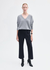 This elegant V-neck long sleeve sweater is crafted from luxurious boiled cashmere, offering a refined texture and medium weight perfect for year-round wear. Its relaxed fit and ribbed trim provide subtle structure while maintaining comfort and ease. The classic grey hue enhances its timeless sophistication, making it an ideal layering piece for both casual and formal occasions. Details - Grey - 100% Cashmere - Deep v-neckline - Rib trim at neck, cuffs, and hem - Medium Weight - Dry Clean Only - Style Number: 7931CMR-CORE Size & Fit - Designed for a relaxed fit. - Size down for a slimmer fit. - Model is 5'10" and wears a size Small.
