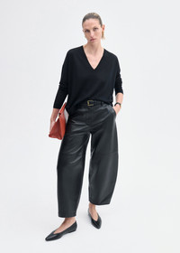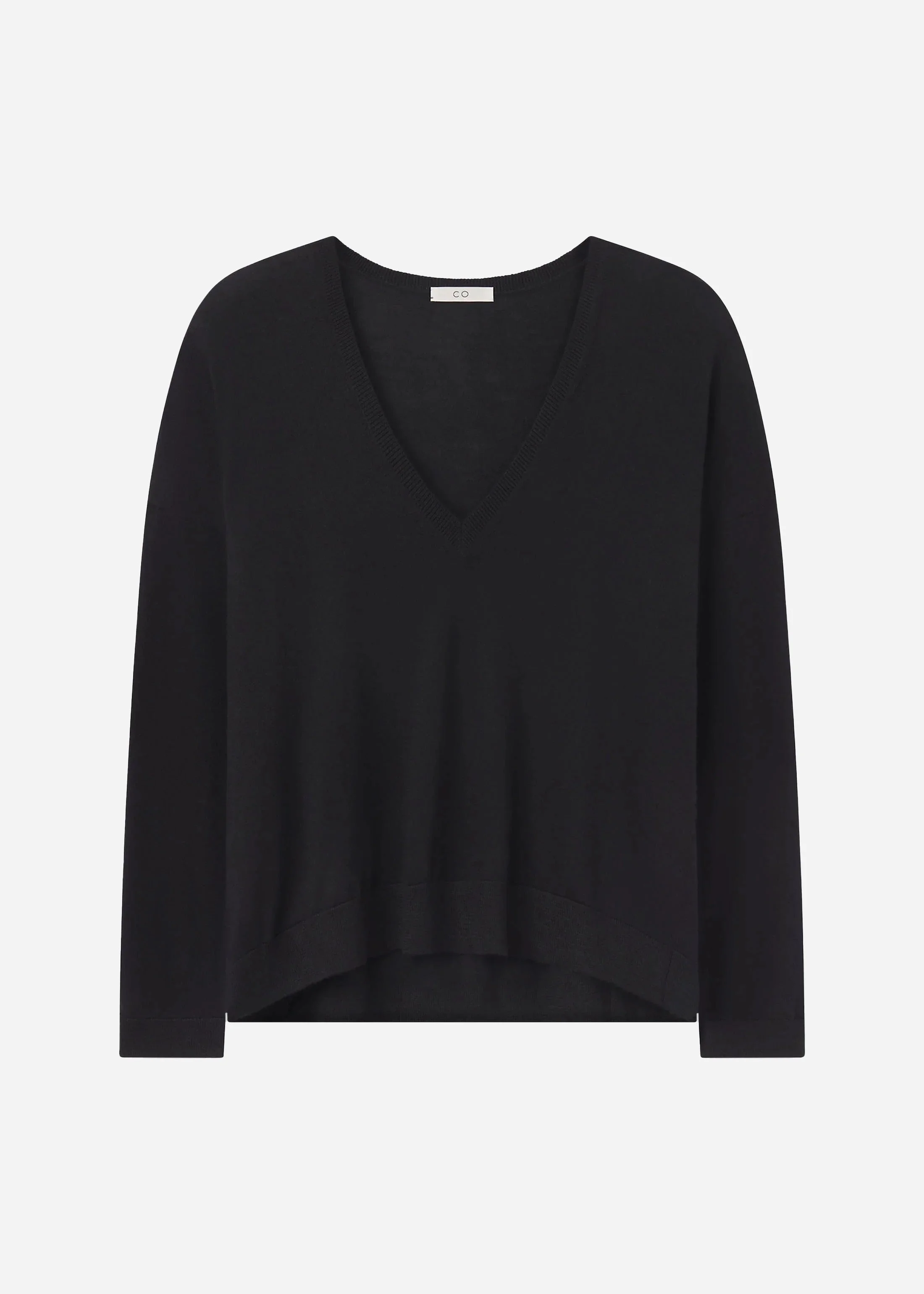 This elegant V-neck sweater in classic black is crafted from fine-gauge cashmere yarn, offering a luxurious softness and warmth. Its relaxed fit and drop shoulder design create a modern silhouette that drapes gracefully at the back, enhancing comfort and style. Finished with a ribbed hem, this sweater combines timeless sophistication with everyday ease. Details - Black - 100% Cashmere - Ribbed Hem - Dry Clean Only - 7891BCM-CORE Size & Fit - Designed with a relaxed fit. - We recommend ordering one size down if you prefer a fitted look.