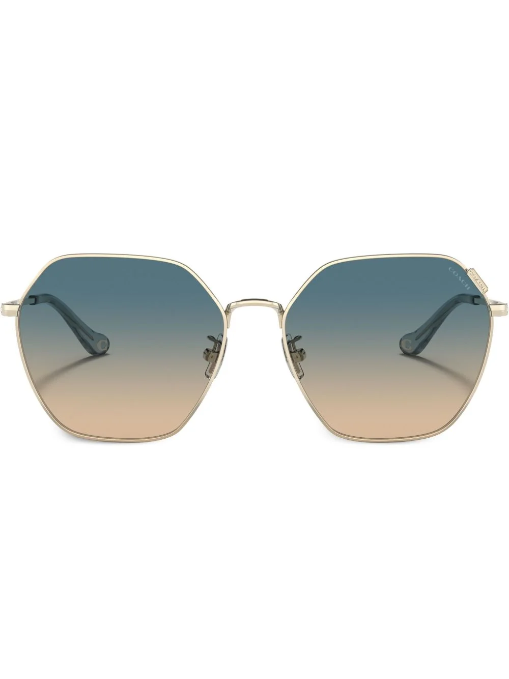 HC7132 C7998 hexagonal-frame sunglasses Highlights - Gold-tone - Metal - Hexagonal frame - Gradient lenses - Nose pads - Logo-engraved arm - Straight arms - Curved tips - These glasses come with a protective case. Made in United States Composition Metal 100% SIZE & FIT Measurement Arm Length 5.51 in(14 cm) Bridge Width 0.62 in(1.6 cm) Lens Diameter 2.28 in(5.8 cm)