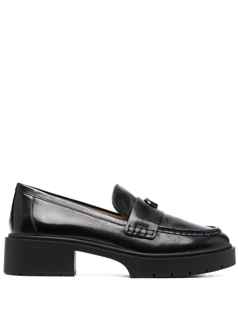 Leah chunky sole leather loafers jet black calf leather logo lettering almond toe branded leather insole low block heel Imported Composition Leather 100% SIZE & FIT Measurement HEEL 1.57 in(4 cm) Sole height 0.78 in(2 cm)