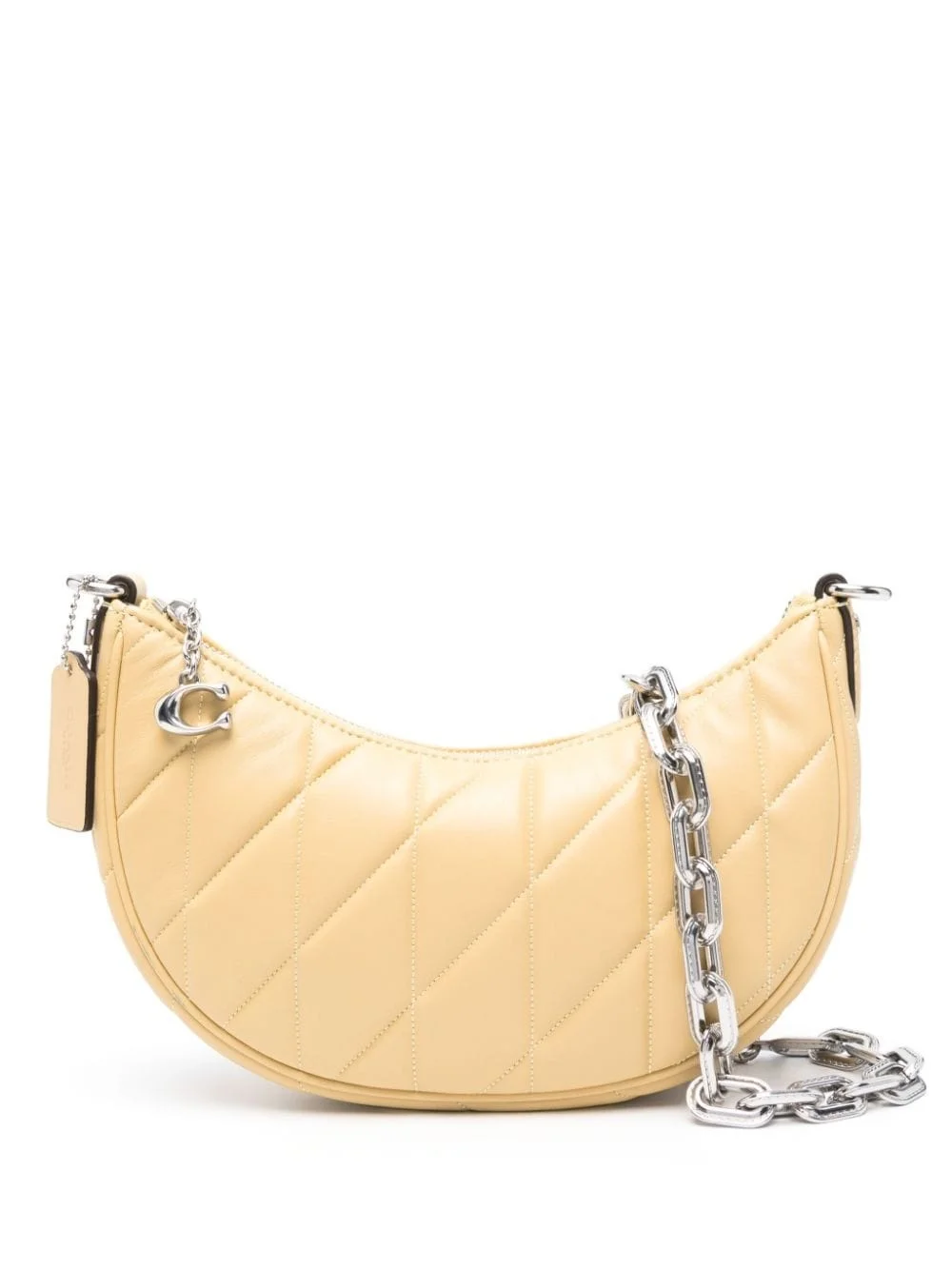 Mira quilted-leather shoulder bag Coach’s yellow Mira bag is a testament to its longstanding history of premium leatherworking. It’s crafted to a structural crescent silhouette and differentiated with angular diamond quilting. The chunky chain-link strap adds an industrial touch. Highlights - Light yellow - Leather - Diamond quilting - Adjustable detachable shoulder strap - Detachable chain-link top handle - Logo tag - Main compartment - Internal stud-fastening pocket - Internal logo patch - Branded zip puller - Silver-tone hardware - Top zip fastening Imported Composition Outer: Leather 100% SIZE & FIT Model measurements Height 5 ft 9 in(1.76 m) Bust/Chest 31.1 in(79 cm) Hips 36.61 in(93 cm) Waist 24.8 in(63 cm) Measurement DEPTH 2.75 in(7 cm) HANDLE 7.87 in(20 cm) HEIGHT 5.9 in(15 cm) STRAP 20.47 in(52 cm)