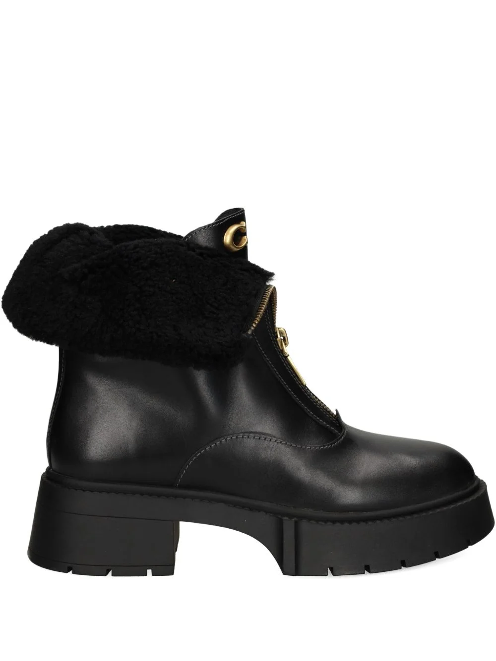 57mm Leah zip-up platform boots Highlights - Black - Shearling trim - Zip fastening - Gold-tone hardware - Platform sole Imported Composition Outer: Calf Leather 100%, Lamb Shearling 100% Lining: Lamb Shearling 100%, Polyurethane 100% Sole: Rubber 100% SIZE & FIT Measurement HEEL 2.24 in(5.7 cm)
