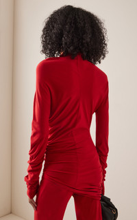 The young creative director and former menswear designer launched her ready-to-wear women’s collection in February ‘24 to critical acclaim. This season, each piece adds to the label’s ethereal aesthetic, exploring femininity through mythical archetypes. Whether at work or play, this bright layer is sure to add a touch of nuance. This gathered top stretches over the frame in cotton-jersey, and is designed with a bateau neckline, exaggerated long sleeves and an asymmetric hem. The matching ‘Poppy Red’ trousers complete this look perfectly. PRODUCT DETAILS - Spring/Summer ‘25 - Slip on - Composition: 92% cotton, 8% elastane - Dry clean - Designer Color: Poppy Red - Made in the USA SIZE & FIT - Our model is wearing a size Small - Model is 5'11" with a 30" bust, 24" waist, and 34" hip