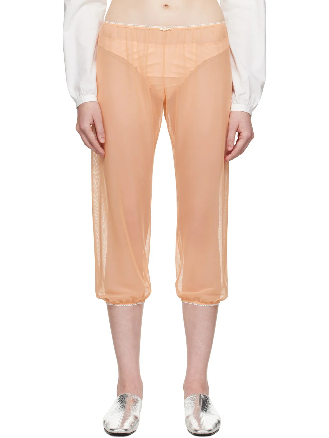 Sheer nylon tulle trousers. · Scalloped edge at elasticized waistband and cuffs · Floral applique at front waistband · Cropped legs Supplier color: Peach 100% nylon. Made in United States 251275F087002