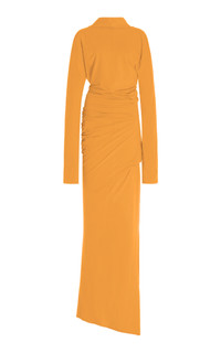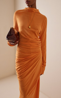 The young creative director and former menswear designer launched her ready-to-wear women’s collection in February ‘24 to critical acclaim. This season, each piece adds to the label’s ethereal aesthetic, exploring femininity through mythical archetypes. Few colors were chosen to embolden this collection, ‘Flaming June’ being one. This rich marigold hue pigments the cotton-jersey selected for this high-neck maxi. The minimal silhouette is designed for a close fit across the bust and waist with a straight skirt. Add a pair of platform heels to balance the floor-sweeping hem. PRODUCT DETAILS - Spring/Summer ‘25 - Concealed zip fastening - Composition: 92% cotton, 8% elastane - Dry clean - Flaming June - Made in the USA SIZE & FIT - Our model is wearing a size Small - Model is 5'10" with a 31" bust, 23.5" waist, and 33.5" hip