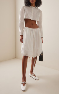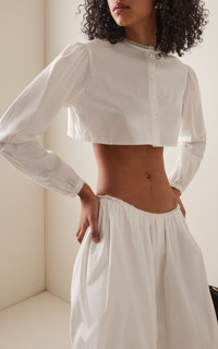 The young creative director and former menswear designer launched her ready-to-wear women’s collection in February ‘24 to critical acclaim. This season, each piece adds to the label’s ethereal aesthetic, exploring femininity through mythical archetypes. Offering a modern approach to shirting, this cropped top is made from crisp cotton-poplin, tailored to a boxy shape with a round collar. Style yours buttoned to the top, with a pair of low-rise shorts. PRODUCT DETAILS - Spring/Summer ‘25 - Button fastening - Composition: 100% cotton - Dry clean - Designer Color: Natural White - Made in the USA SIZE & FIT - Our model is wearing a size Small - Model is 5'11" with a 30" bust, 24" waist, and 34" hip