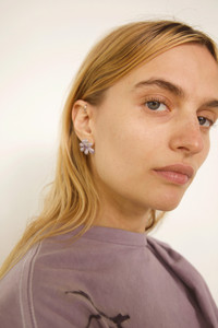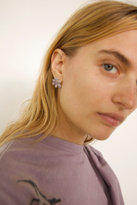 Sterling silver flower blossom earring encrusted in amethyst gemstones. Stud back. 2 x 2.5 cm 100% Sterling Silver and Cubic Zirconia Jewelry bag is handmade with fabric scraps from our New York studio. Each jewelry bag is one of a kind. This is a costume jewelry piece. Please use care with this item and do not wear while bathing or swimming.