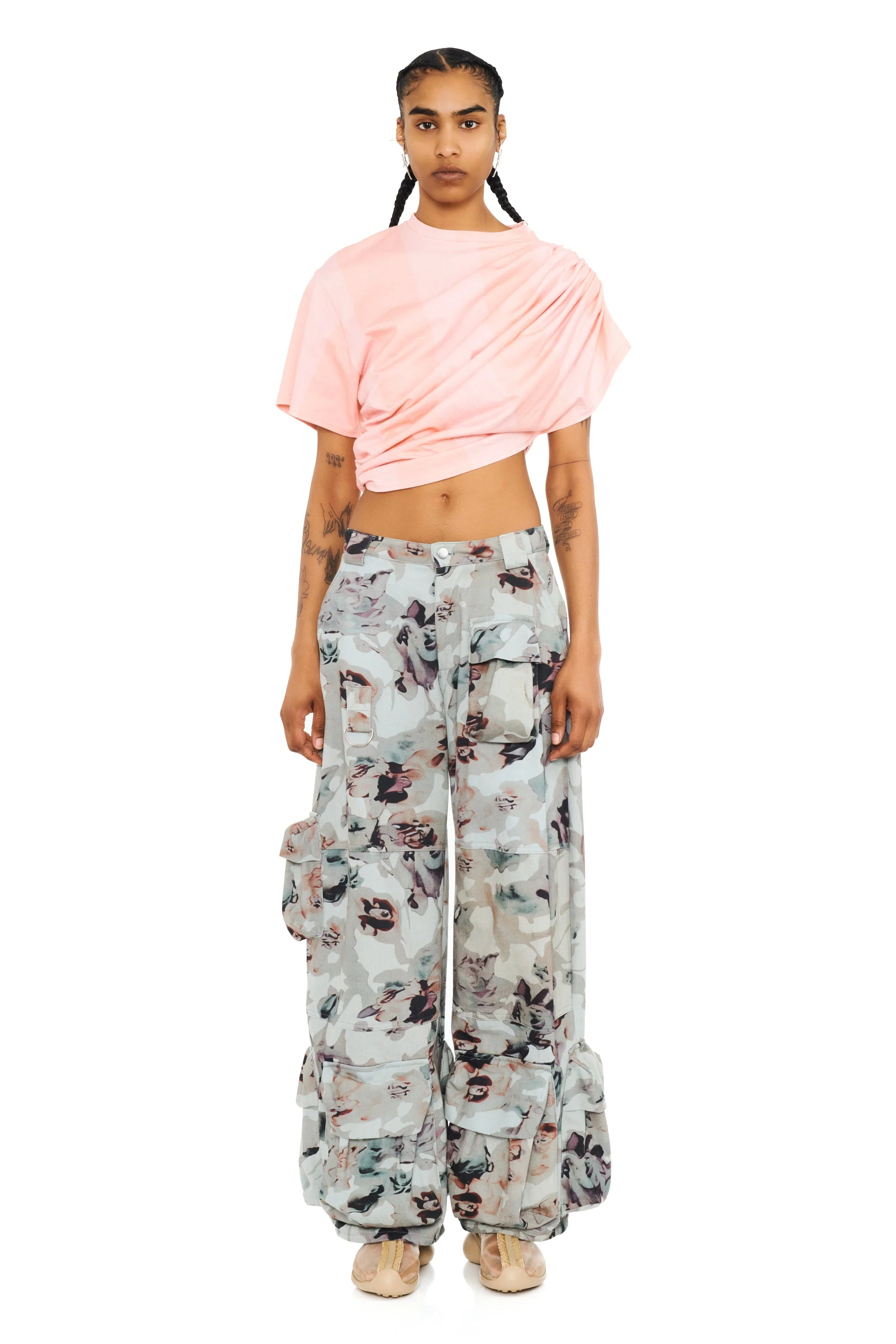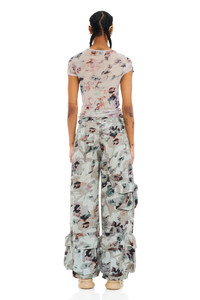 Relaxed fit with mid rise, wide leg cargo pant with large pockets all over so you can go out without a bag! Collina Strada's custom Beige Watercolor Roses denim print. 100% Cotton Model wears a small and is 5'9''. - 30 1/2" inseam; 22" leg opening; 11 1/2" front rise; 14" back rise (size Medium) - Zip fly with button closure - Front slant pockets; cargo bellows pockets; back patch pockets - 100% cotton - Dry clean - Made in the USA