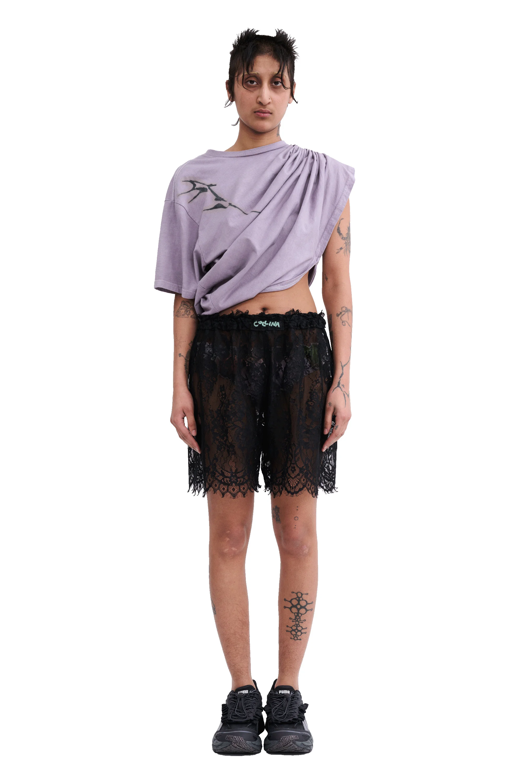 Elastic waist lace boxer short. Embroidered ‘Collina’ tag at waist. 100% Deadstock Polyester Model wears a Small. Made in New York - 6" inseam; 32" leg opening; 15 1/2" front rise; 15 1/2" back rise (size Medium) - Elastic waist - Sheer; base layer shown not included - 100% deadstock polyester - Dry clean - True to size. - XS=00-0, S=2-4, M=4-6, L=6-8, XL=10-12.