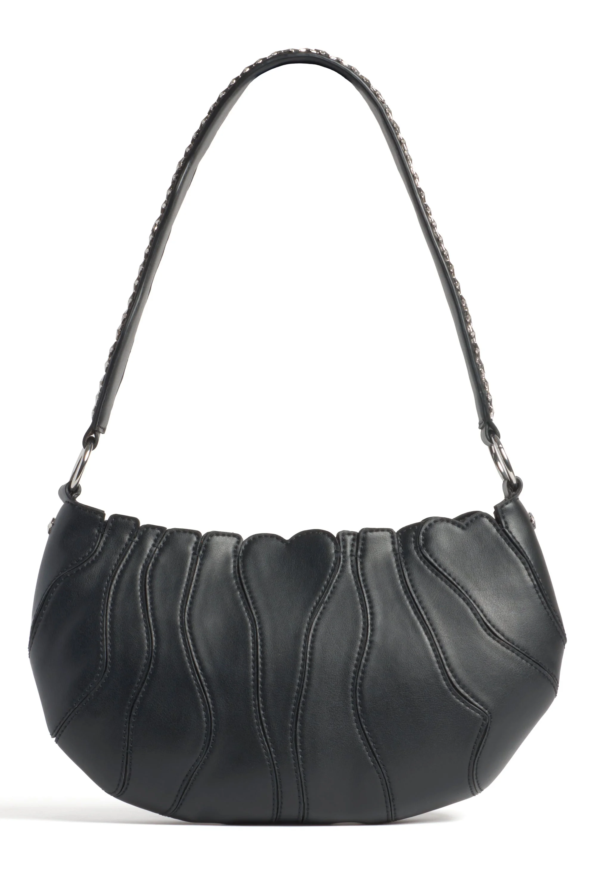 Organically shaped puffy bag with star studded strap. Fully lined, interior pocket. 100% Vegan leather (Vegea made from grapes) Made in India 13x7x3”, strap 23”