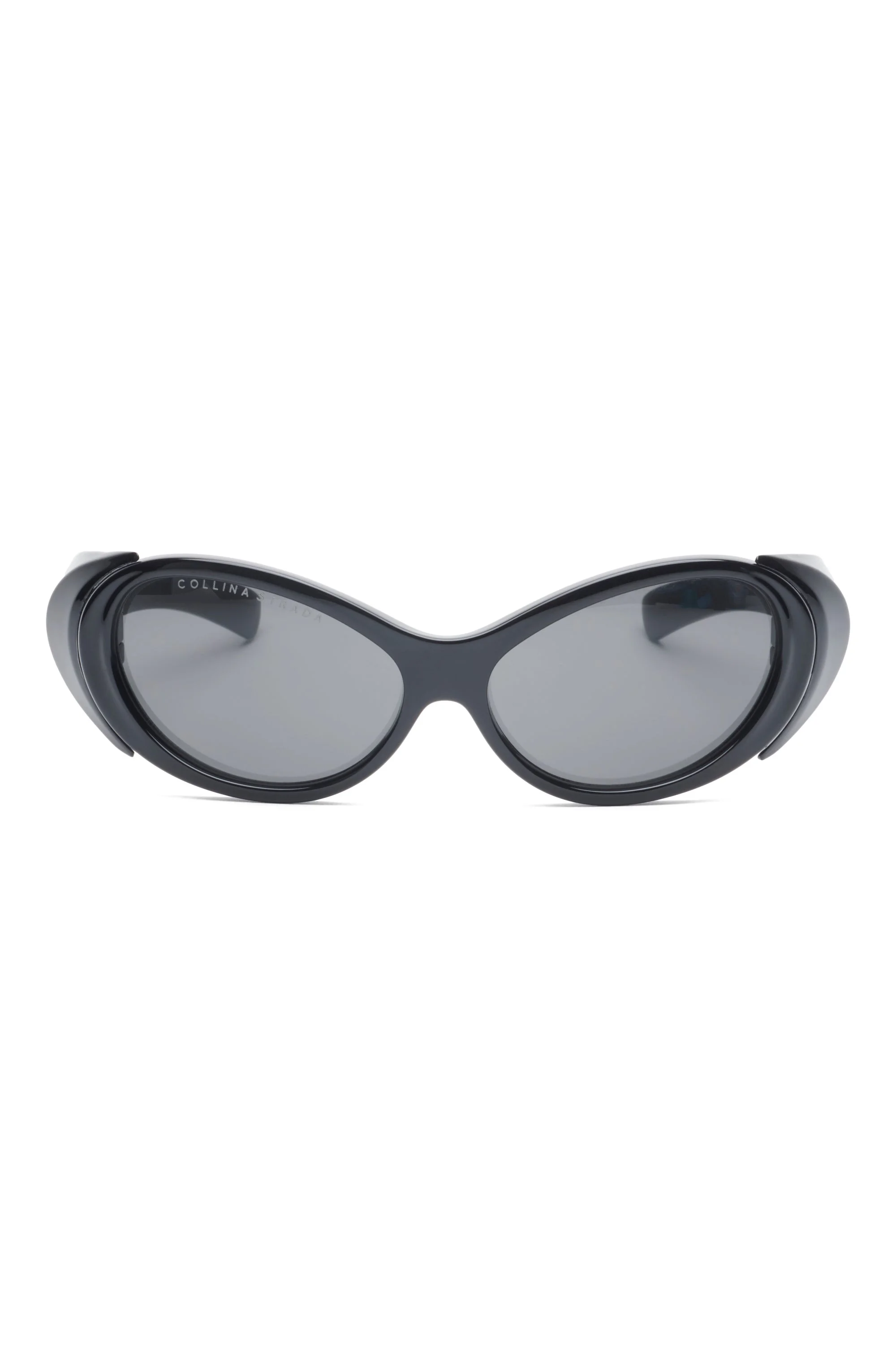 Collina Strada Cocoon sunglasses. Oval shaped glasses. Black frames with dark grey lens lens. 100% Acetate Frame 99.9% UV Protection Frame Front: 150.2mm, Frame Side: 145mm Lens Width58mm, Lens Height: 37 mm Bridge: 15mm Made in China