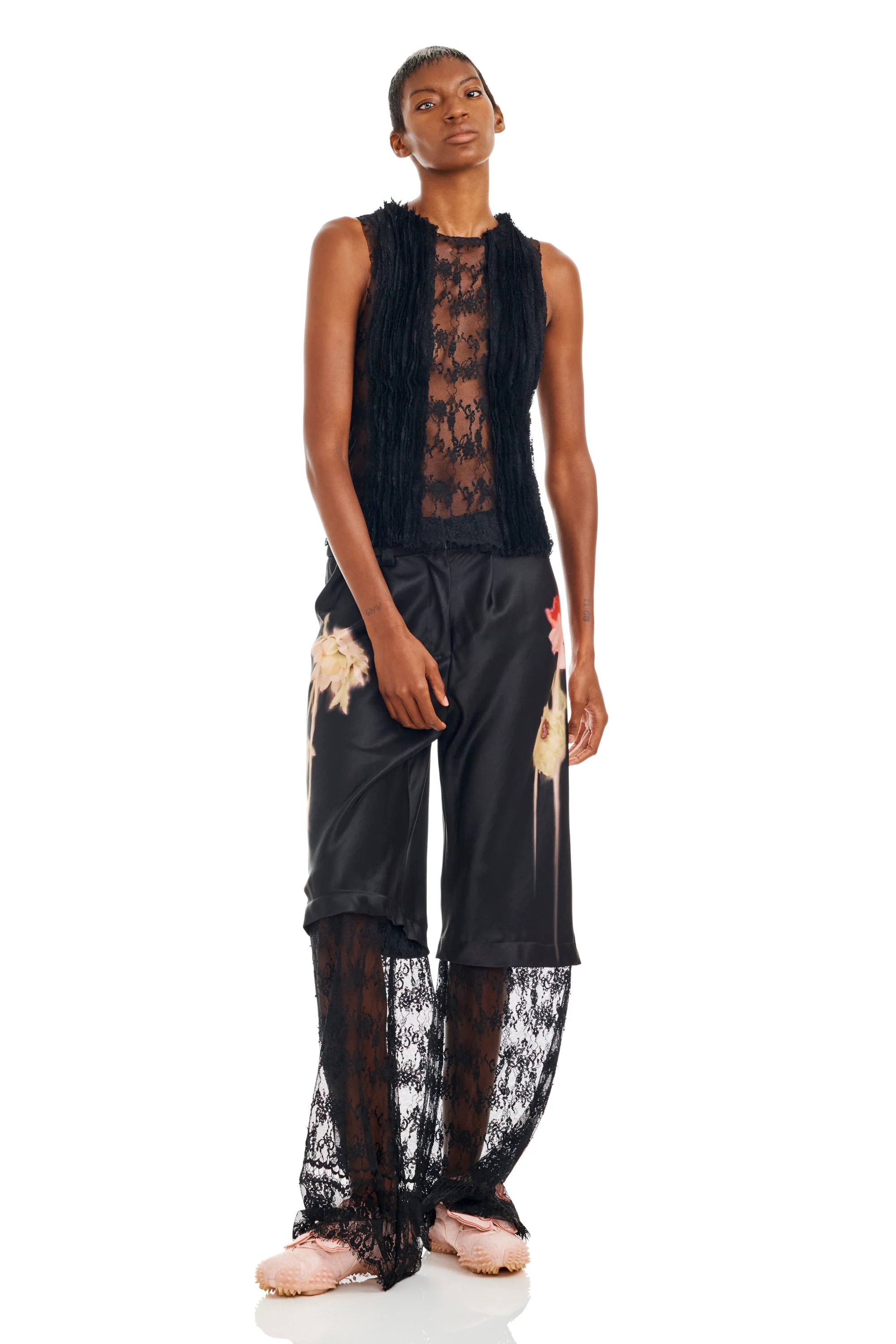 Sleeveless semi-sheer lace top with a striking mix of textures. Side zipper. Model wears a small and is 5'9''. - Sheer - Unlined - 51% nylon, 49% recycled nylon - Dry clean - Made in the USA - True to size. - XS=0-2, S=2-4, M=4-6, L=6-8, XL=10-12.
