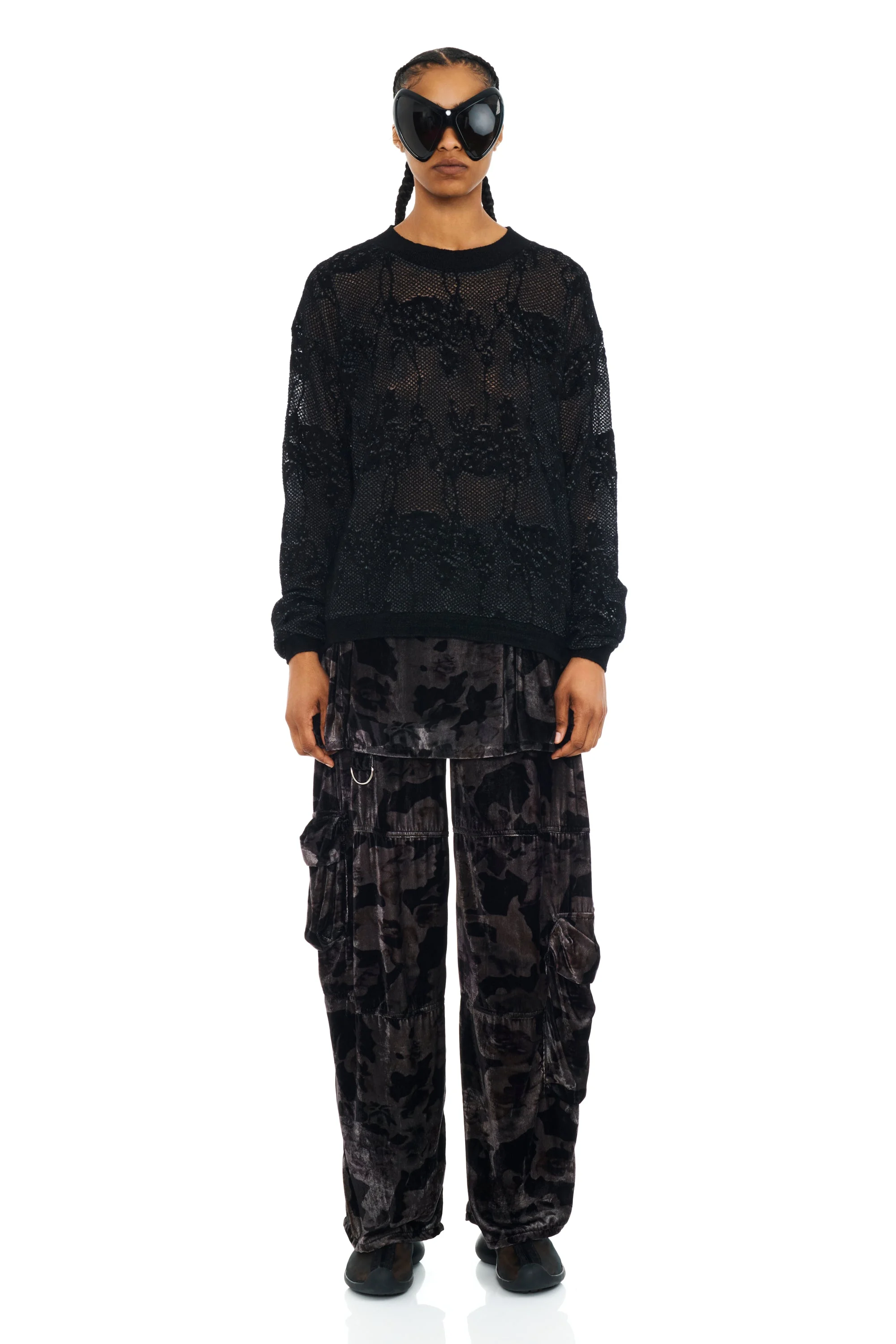 Black Knit Lace oversized crew neck sweater. Model wears a size Small. Made in Italy with upcycled and deadstock yarns. 70% Polyamide, 18% Viscose, 10% Polyester, 2% Elastane - Oversize fit. - XS=00-0, S=2-4, M=4-6, L=6-8, XL=10-12.