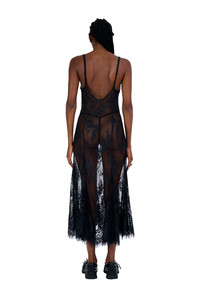 Mid length slip dress in lace. Sheer. 49% Recycled Nylon, 51% Nylon. Lining 100% Nylon Made in New York Model wears a size Small