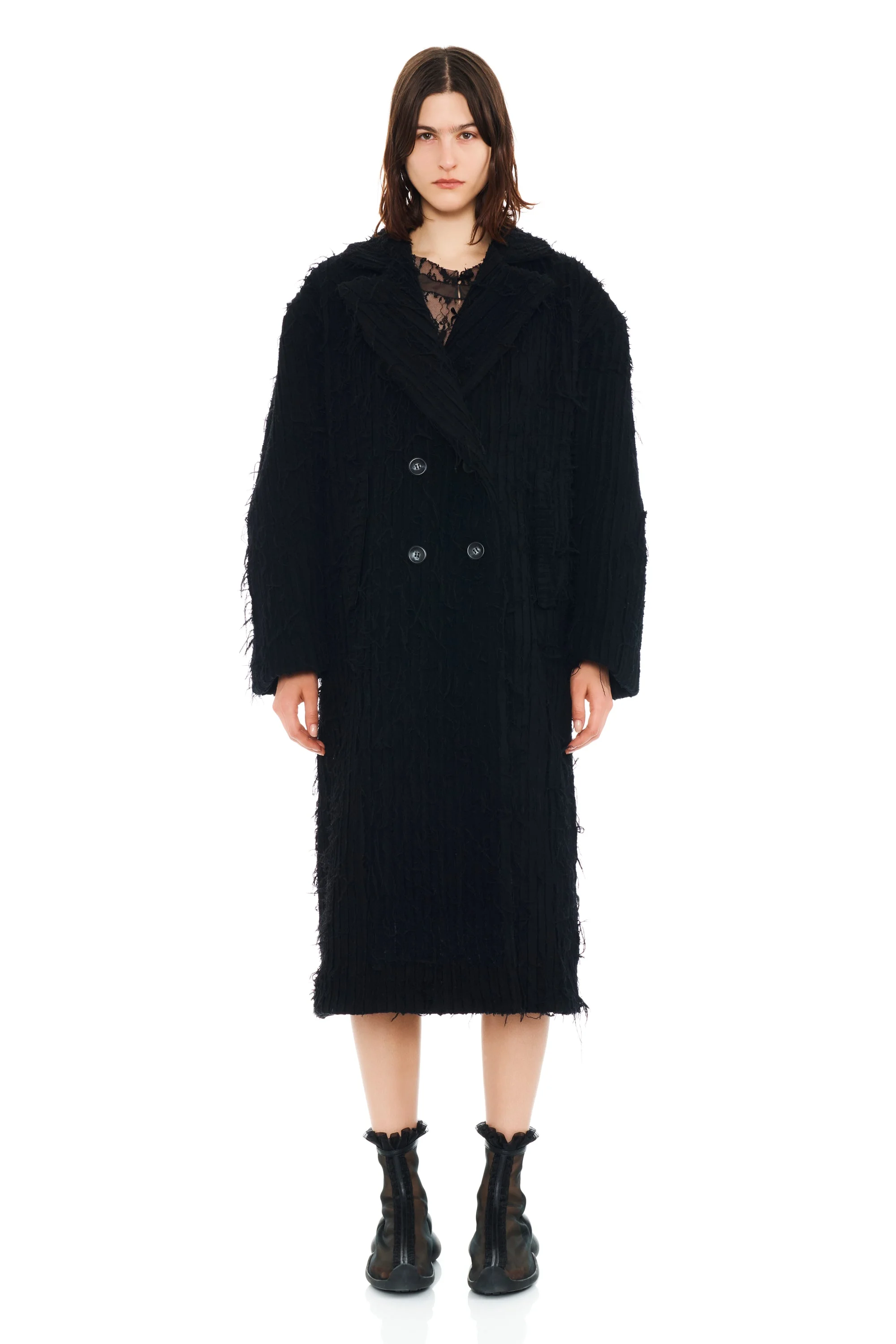 Voluminous textured coat double breasted with side pockets. Fully lined. Made from reclaimed wool coats. 100% Upcycled thrifted wool coats given new life Model wears size Small and is 5'11'' Made in New York