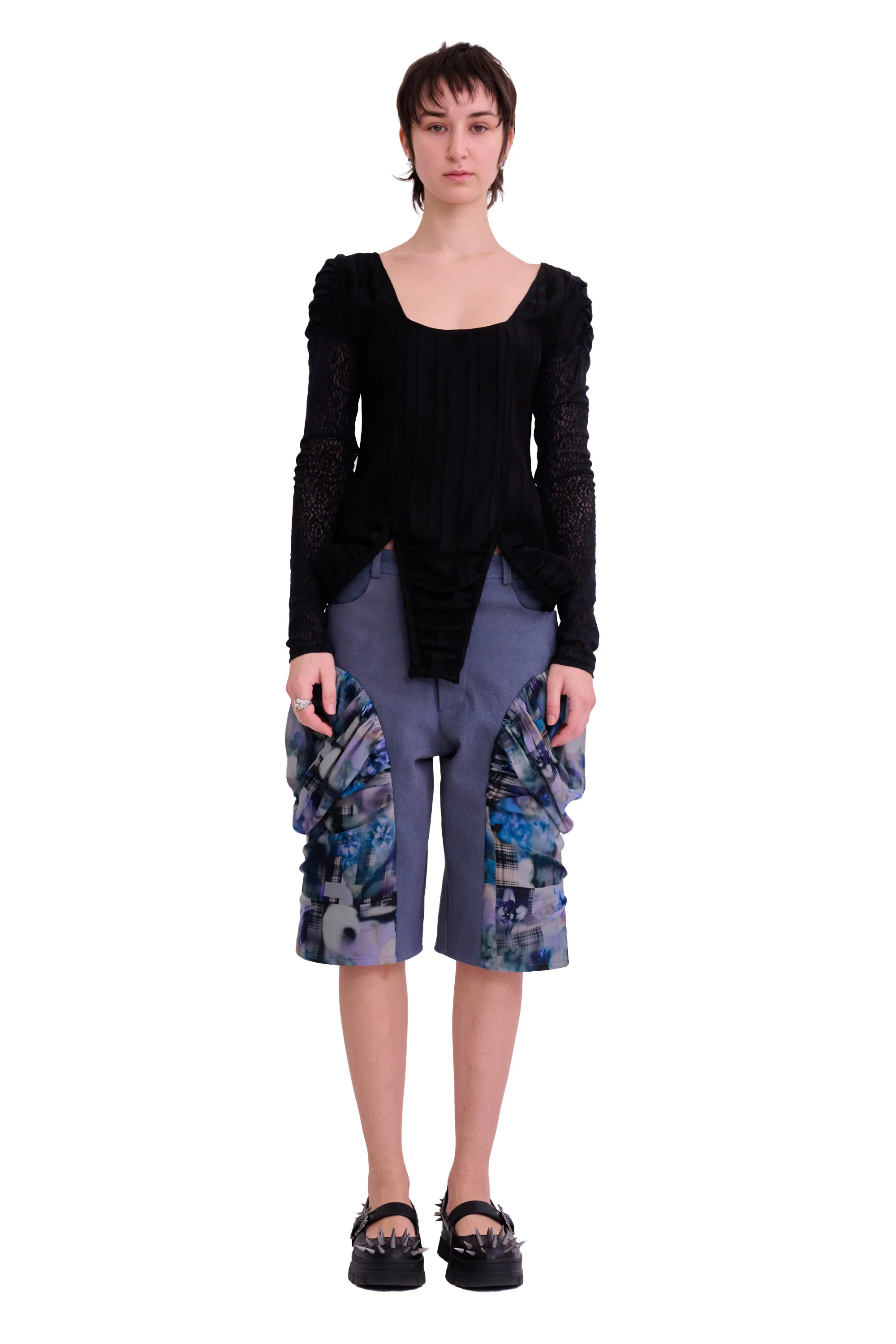Long sleeve bodysuit style top. Ruched lace sleeves and black satin bodice. Deadstock lace 95% polyester 5% spandex, satin 42% triacetate 40% cupro 18% polyester Model wears size Small Made in New York - True to size. - XS=00-0, S=2-4, M=4-6, L=6-8, XL=10-12.