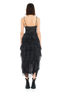 Long dress with twisted spaghetti straps and alternating chiffon and organza ruffles. Asymmetrical hem. Collina Strada’s Black Watercolor Roses print. 100% Silk Made in USA Model wears a size Small Print placement may vary - True to size. - XS=00-0, S=2-4, M=4-6, L=6-8, XL=10-12.