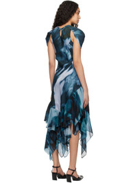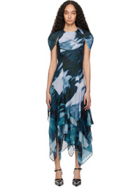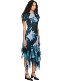 Bias-cut rose sylk satin and silk chiffon maxi dress. Graphic and logo pattern printed throughout. · Round neck · Structured cap sleeves · Piping at chest · Ruffles at handkerchief hem · Hook-eye fastening at back collar Supplier color: Navy melting bloom Body 1: 100% rose sylk. Body 2: 100% silk. Made in United States 251236F055002