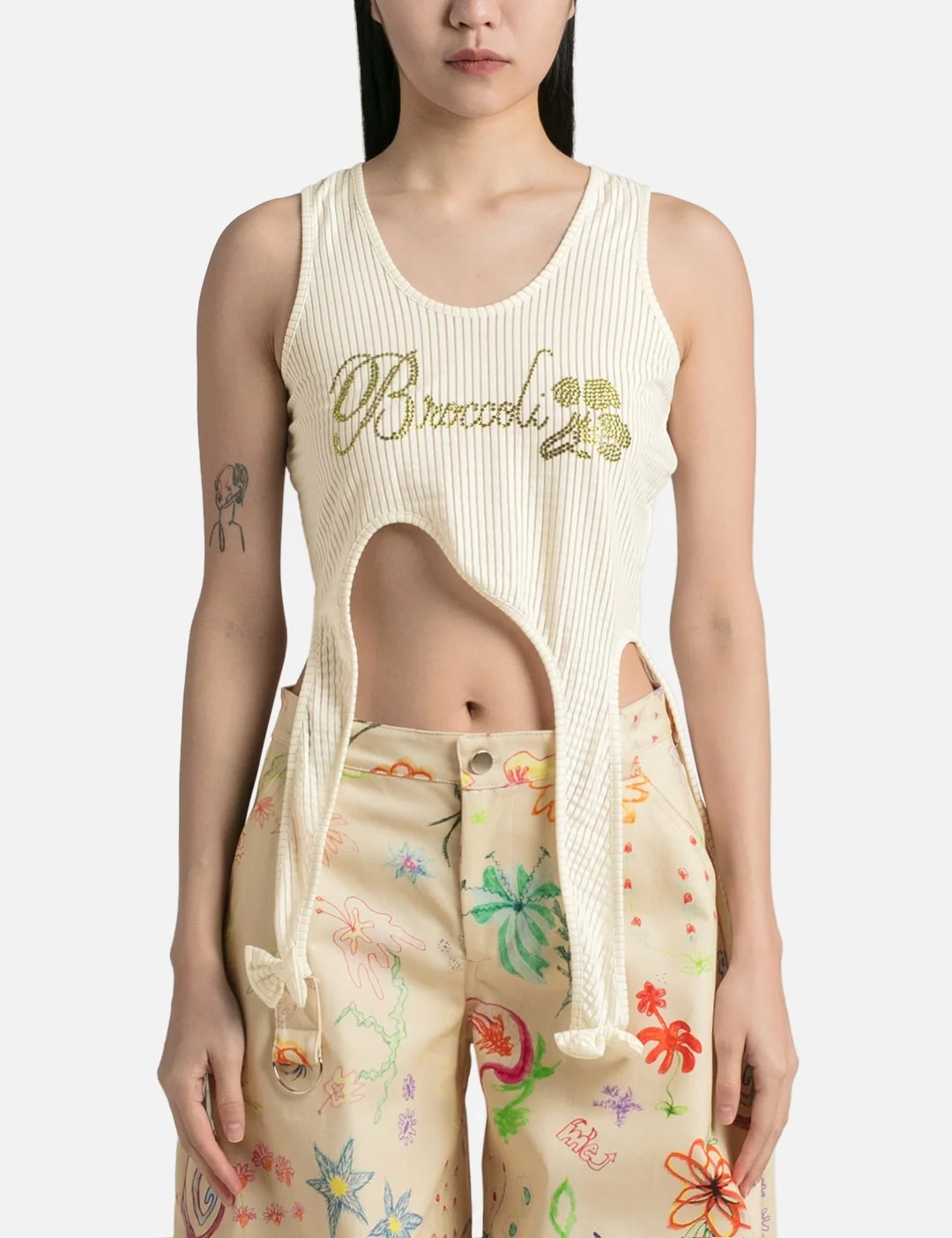 - Collina Strada - Broccoli Thistle Tank - Cropped tank top - Made from deadstock seersucker fabric - Asymmetrical hem - Striped - Hanging straps detail - Broccoli text and graphic in rhinestone at front - Color: Seersucker - Material: 95% Polyester, 5% Spandex - See more Tops and Clothing SIZING - Model wears size UK XS - Model measures: Height 170cm, Chest 29”/75cm, Waist 22”/57cm, Hip 33”/86cm