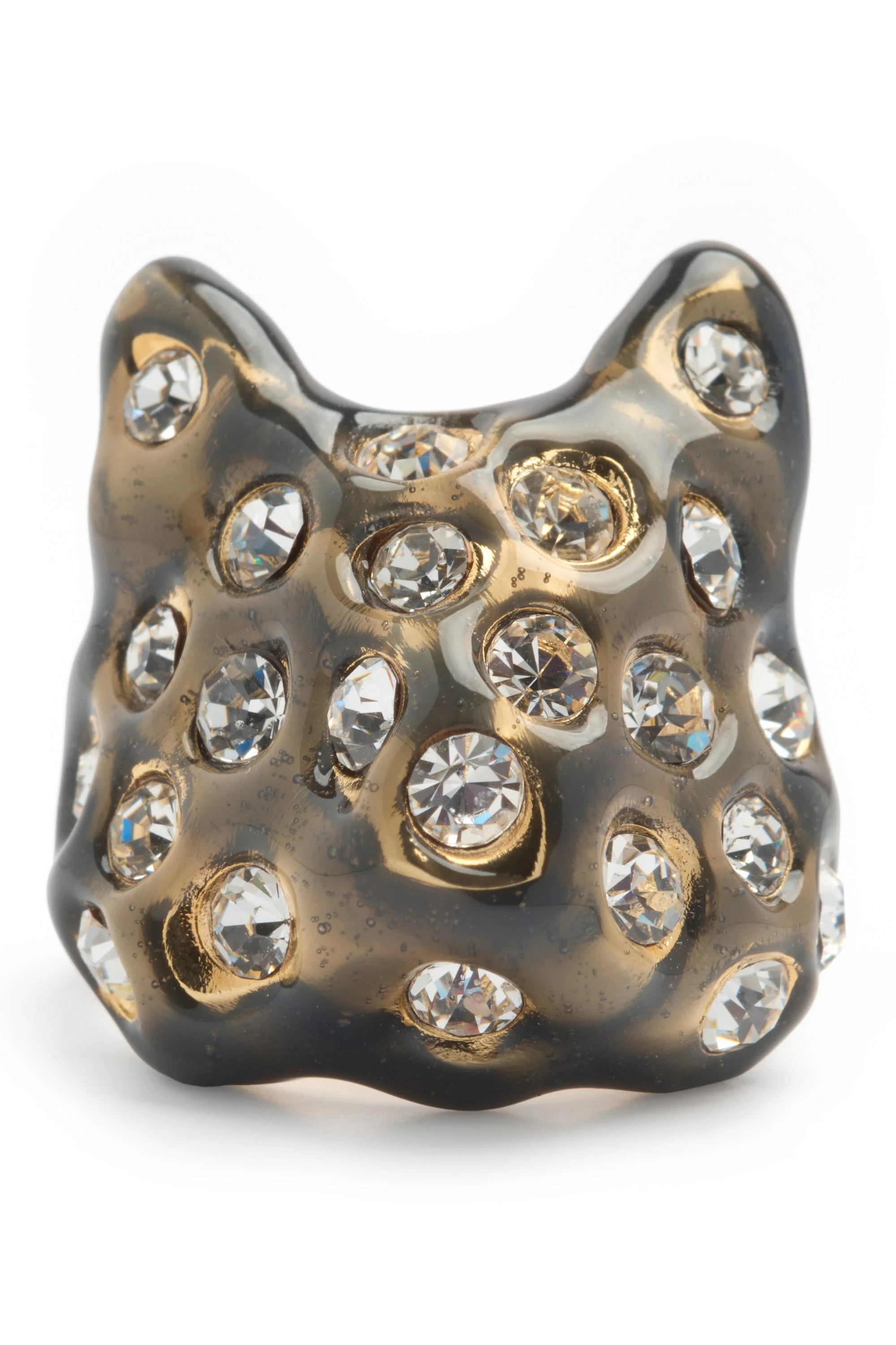 Puffy bunny ring with rhinestone freckles. Hand enameled. Recycled pewter and deadstock Swarovski crystals Hand enameled Made in the USA This is a costume jewelry piece. Please use care with this item and do not wear while bathing or swimming. Excessive wear may cause the finish to deteriorate. Jewelry bag handmade with fabric scraps from our NY studio. Each jewelry bag is one of a kind.