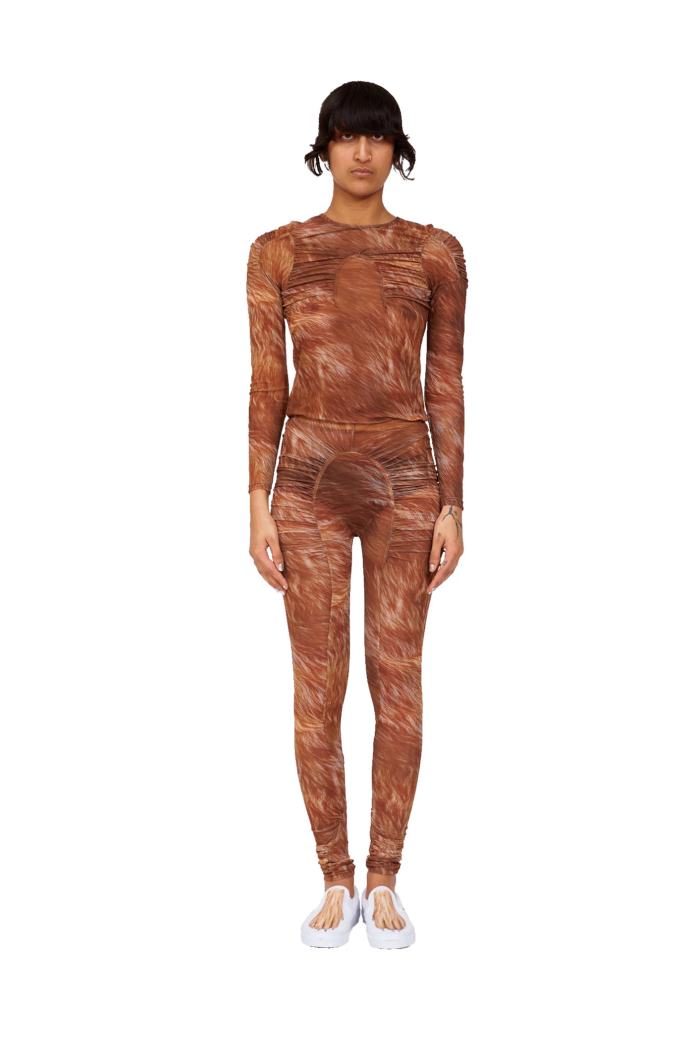 Mesh legging with ruched arc details in our Brown Fur print. Elastic waist. Made in New York 95% Polyester 5% Spandex Model wears size Small Print placement may vary.