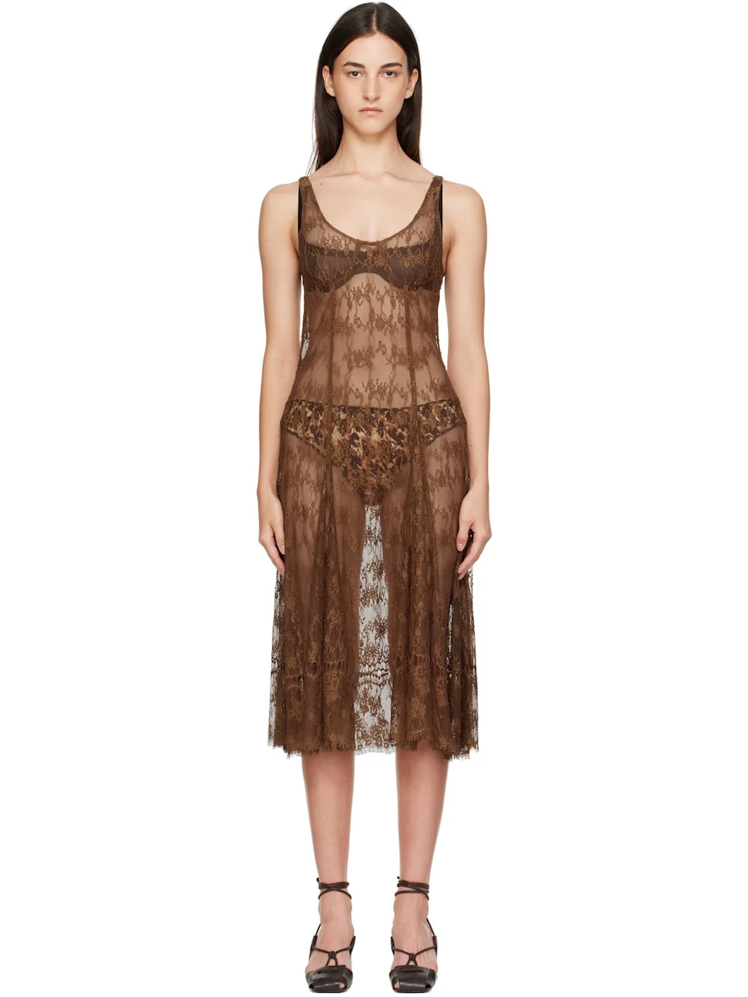 Recycled nylon-blend lace maxi dress. · Sheer · Embroidered floral pattern throughout · Scoop neck · Adjustable shoulder straps · Godet panels at hem Supplier color: Earth 51% nylon, 49% recycled nylon. Made in United States 252236F055001
