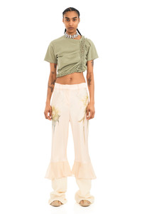 Relaxed fit, mid rise satin trouser to knee with ruffle and design on the side. Satin to knee with chiffon ruffle and knit waffle hem. Made in New York - Runs large - XS=0-2, S=2-4, M=4-6, L=6-8, XL=10-12.