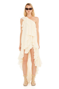 One-shoulder, full length silk chiffon evening dress with ruffles and lace details and an asymmetrical hem. Model wears a size Small and is 5'9''. - True to size. - XS=0-2, S=2-4, M=4-6, L=6-8, XL=10-12. - Scoop neck - Sleeveless - Dry clean - Made in the USA