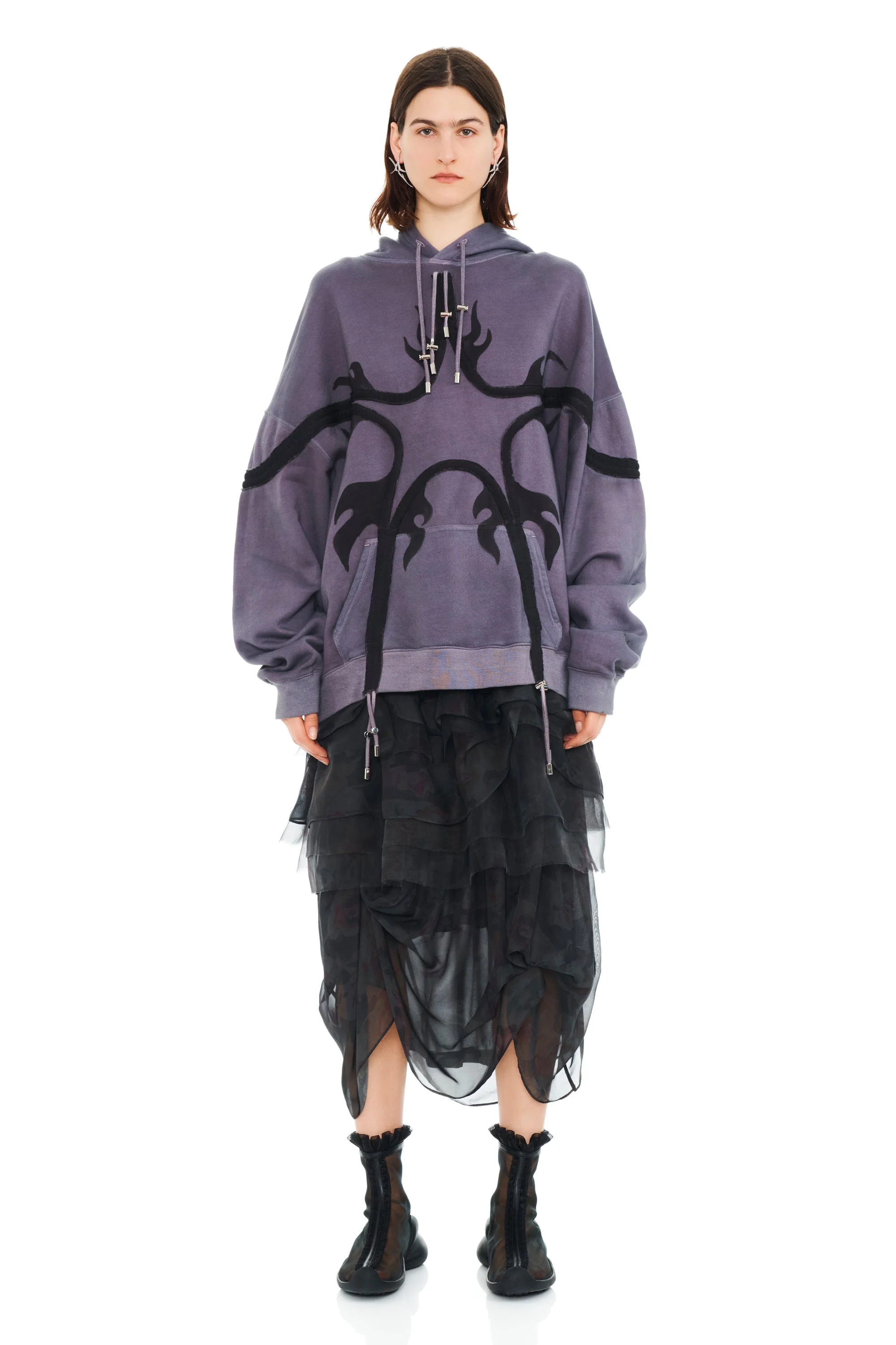 Hand dyed oversized hoodie with star drawstring detail at center front and around sleeve. Can be worn scrunched or straight for full star effect. 100% deadstock cotton Model wears X Large Made in Portugal, finished in New York This is a hand dyed garment, there may be slight variations. Oversize fit: - XS=0-2, S=2-4, M=4-6, L=6-8, XL=10-12.