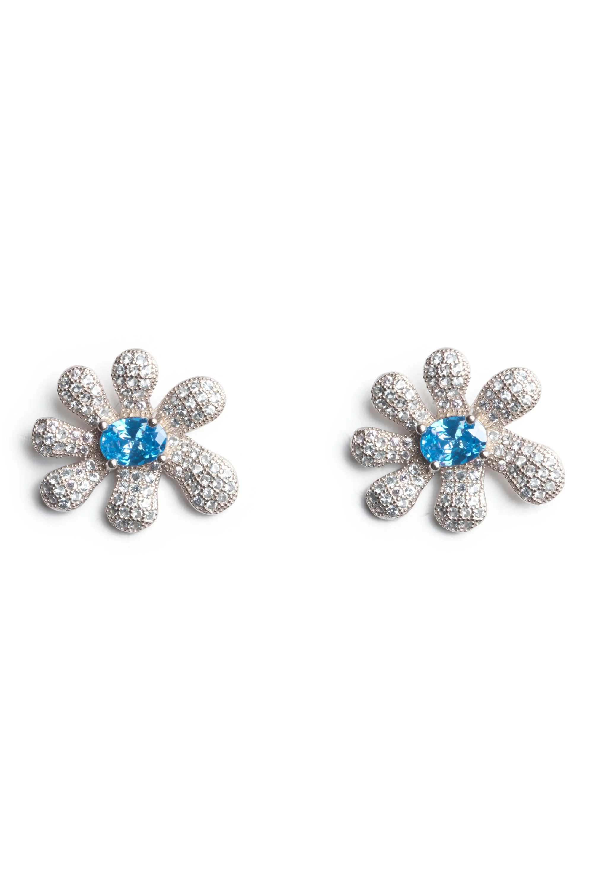Sterling silver flower blossom earring encrusted in clear rhinestones and a sky blue gemstone in the center. Stud back. 2 x 2.5 cm 100% Sterling Silver and Cubic Zirconia Made in China This is a costume jewelry piece. Please use care with this item and do not wear while bathing or swimming. Jewelry bag handmade with fabric scraps from our NY studio. Each jewelry bag is one of a kind.