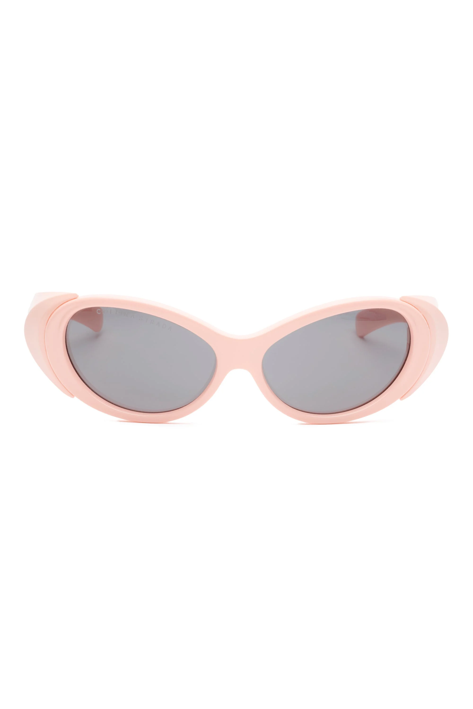 Collina Strada Cocoon sunglasses. Oval shaped glasses. Light pink frames with grey lens. 100% Acetate Frame 99.9% UV Protection Frame Front: 150.2mm, Frame Side: 145mm Lens Width58mm, Lens Height: 37 mm Bridge: 15mm Made in China