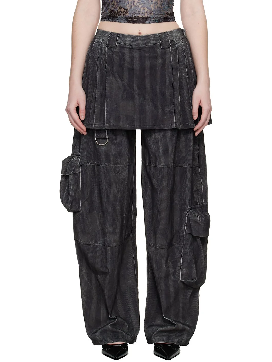Cotton corduroy cargo pants. Integrated pleated skirt-style overlay. · Fading, stripes, and floral pattern printed throughout · Mid-rise · Loose-fit, straight-leg · Belt loops · Four-pocket styling · Zip closure at side seam · D-ring at front leg · Cargo pocket at outseams and back leg Supplier color: Black Wavy Flower Stripe 100% cotton. Made in United States 261236F087005