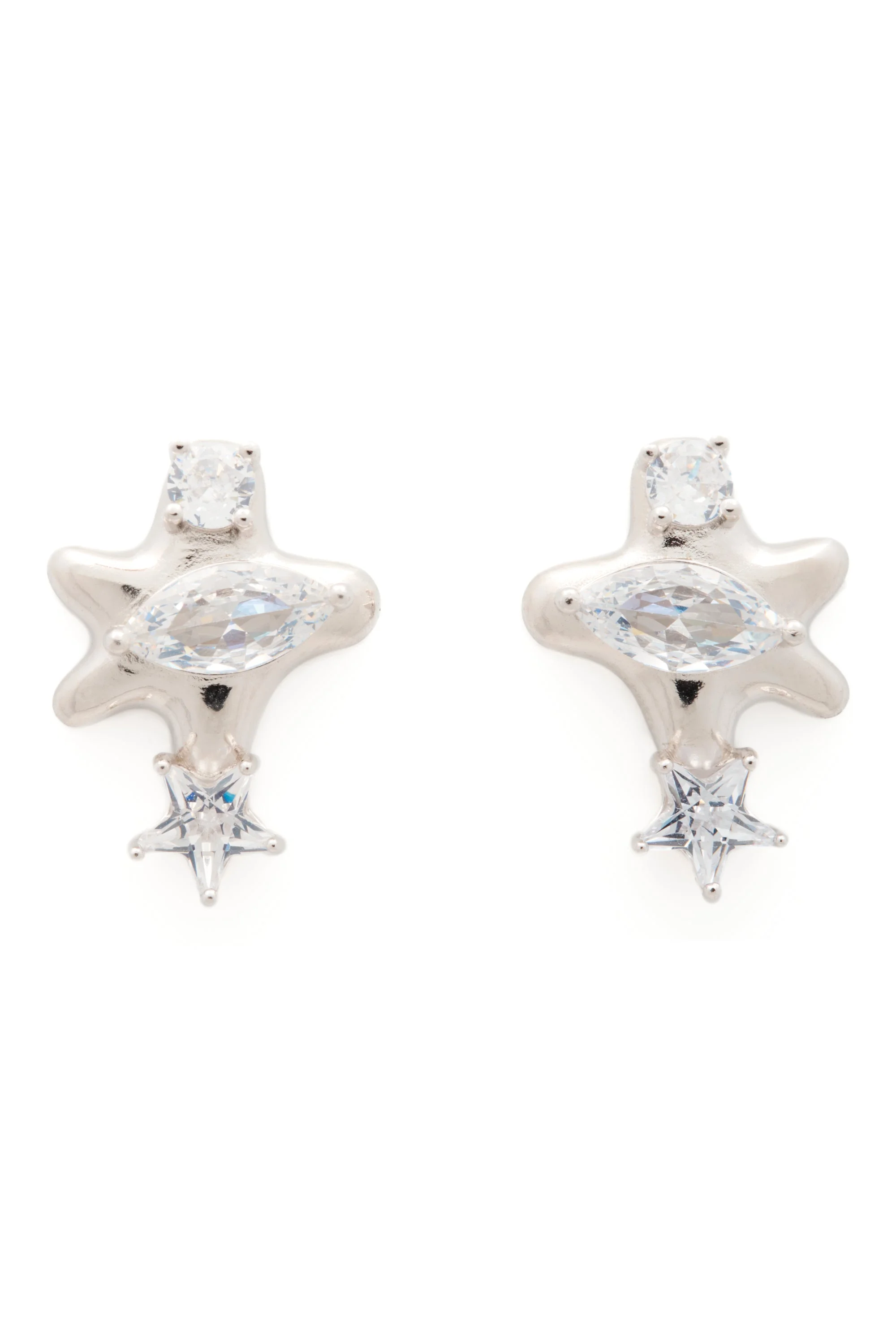 Clear crystal earrings with accent crystals in the shape of a star with a larger crystal at the center. Stud back.100% sterling silver and cubic zirconia 1.5 x 3.5 cm Jewelry bag handmade with fabric scraps from our NY studio. Each jewelry bag is one of a kind. This is a costume jewelry piece. Please use care with this item and do not wear while bathing or swimming.
