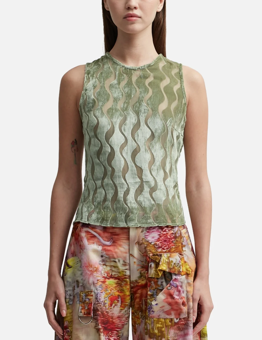 - Collina Strada - Dachi Top - Made from deadstock polyester - Swirl pattern velvet exterior - Semi-sheer design - Hook closure at rear neck - Color: Sage - Material: Deadstock Polyester - See more Tops and Clothing SIZING - Model wears size XS - Model measures: Height 175cm, Chest 33”/83.8cm, Waist 23”/58.4cm,Hip 34”86.4cm