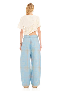 Mid rise, pleated relaxed fit pant with a custom print on cotton. 100% Cotton Model wears a size Small and is 5'9''. - Oversize fit, we recommend sizing smaller. - XS=0-2, S=2-4, M=4-6, L=6-8, XL=10-12 Made in USA Dry Clean Only