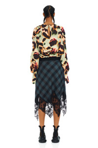 Drippy Leopard puffed long sleeves with gathered detailing at the shoulders and cuffs. The front has a cinched waist with tie detail. Keyhole at the back. Model wears size Small and is 5'9''. 100% Crinkle Cotton Made in USA - True to size. - XS=0-2, S=2-4, M=4-6, L=6-8, XL=10-12.