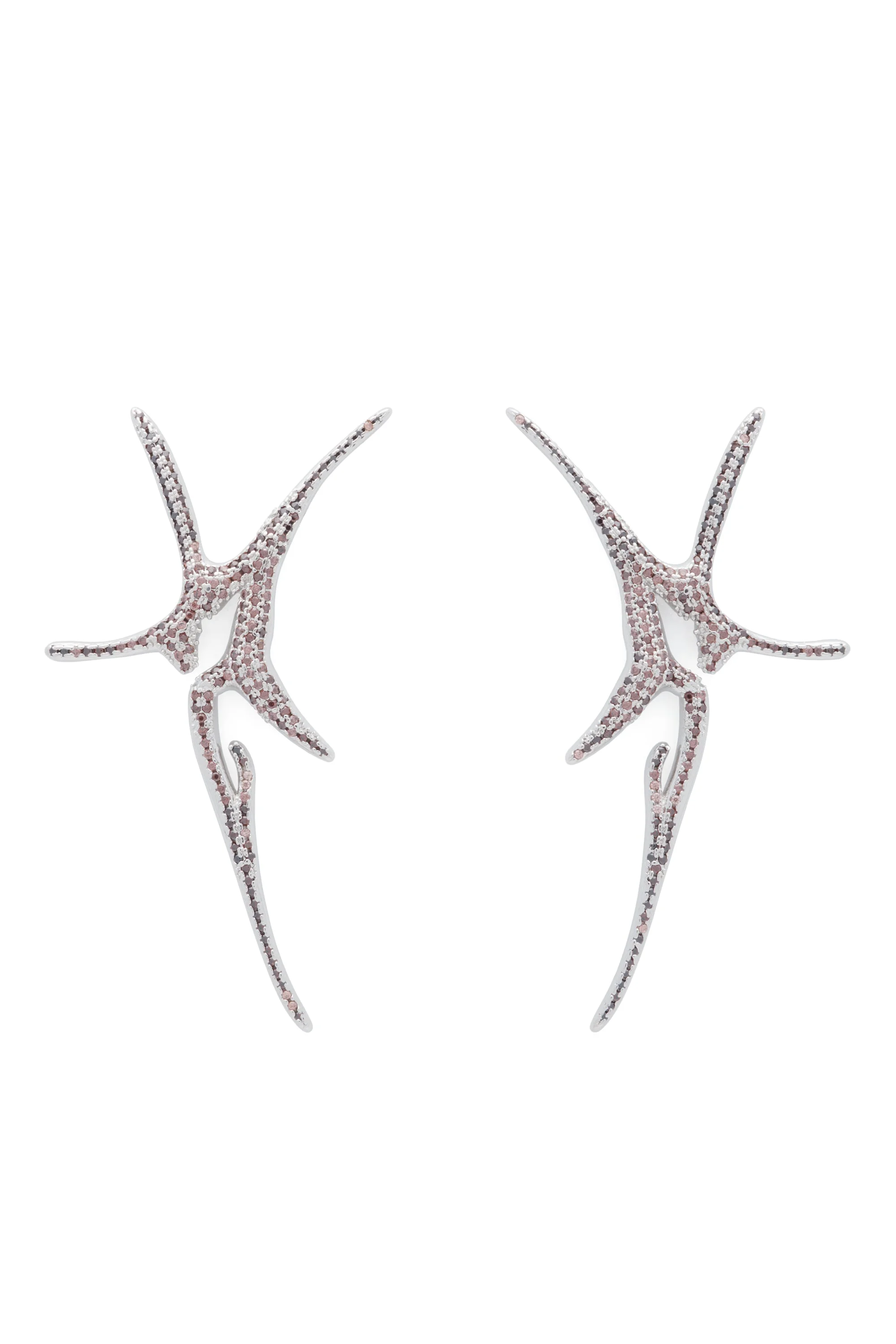 Delicate crystal pave stud earrings in an organic star shape. Stud back.Sterling silver and Swarovski crystals Sterling silver and crystal rhinestones. 60 x 30 mm Jewelry bag handmade with fabric scraps from our NY studio. Each jewelry bag is one of a kind. This is a costume jewelry piece. Please use care with this item and do not wear while bathing or swimming.