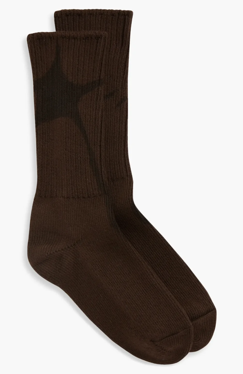 Earth Starburst socks with hand painted design. 98% organic cotton 1% nylon 1% spandex One size fits most Made in USA Each item is hand dyed, there may be slight variation.