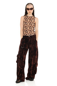 Relaxed fit with mid rise, wide leg cargo pant with large pockets all over so you can go out without a bag! Crushed velvet 63% Acetate 37% Cupro Rayon Model wears a Small. - 30 1/2" inseam; 22" leg opening; 11 1/2" front rise; 14" back rise (size Medium) - Zip fly with button closure - Front slant pockets; cargo bellows pockets; back patch pockets - 100% cotton - Dry clean - Made in the USA - True to size XS=0, S=2-4, M=6-8, L=8-10