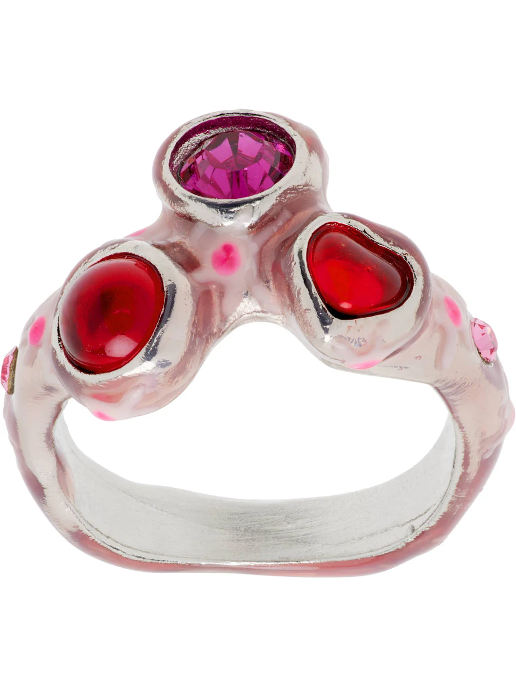 Enameled recycled pewter ring in pink. · Hand-painted floral graphics throughout · Bezel-set Swarovski crystals at face Supplier color: Pink flowers Recycled pewter, crystal. Made in United States 261236F024004