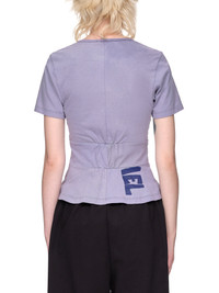 Collina Strada shirt in lilac, crew neck collar, short sleeves, front ruching detail, notched hemline, back graphic design, babydoll silhouette. Made in New York. Standard Sizing. Composition: 100% Uncycled Shirts. Model is 5ft 8” and is wearing a size XS. Bust: 32” Waist: 24” Hip: 35"