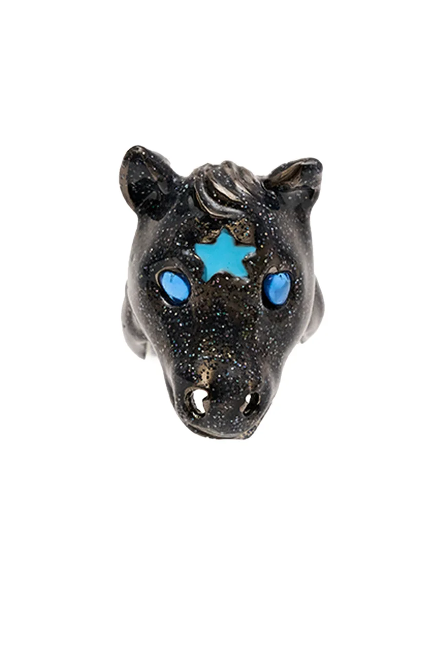 Baby pony ring in glitter grey with cyan blue eyes and star. 100% recycled pewter Hand enameled Made in the USA This is a costume jewelry piece. Please use care with this item and do not wear while bathing or swimming. Excessive wear may cause the finish to deteriorate. Jewelry bag handmade with fabric scraps from our NY studio. Each jewelry bag is one of a kind.